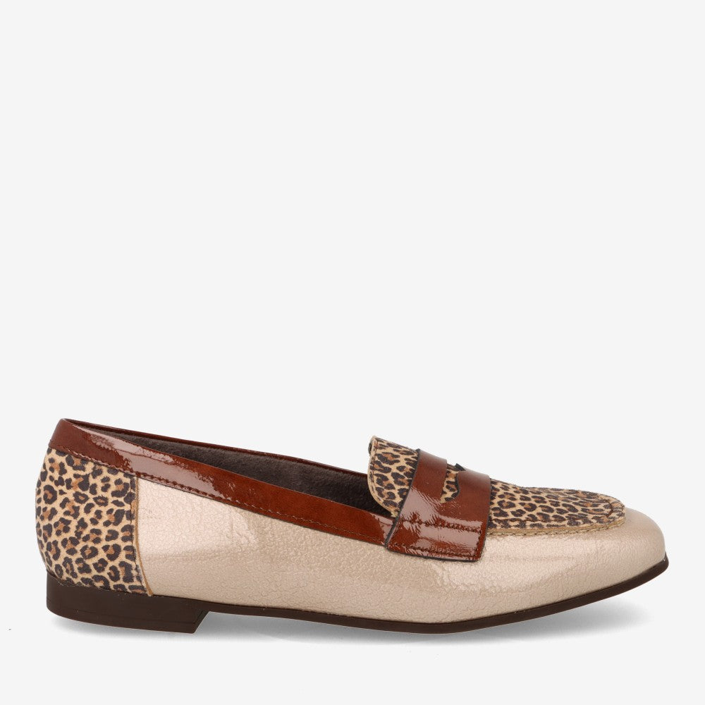 Mocasín plano en charol con detalle animal print.
